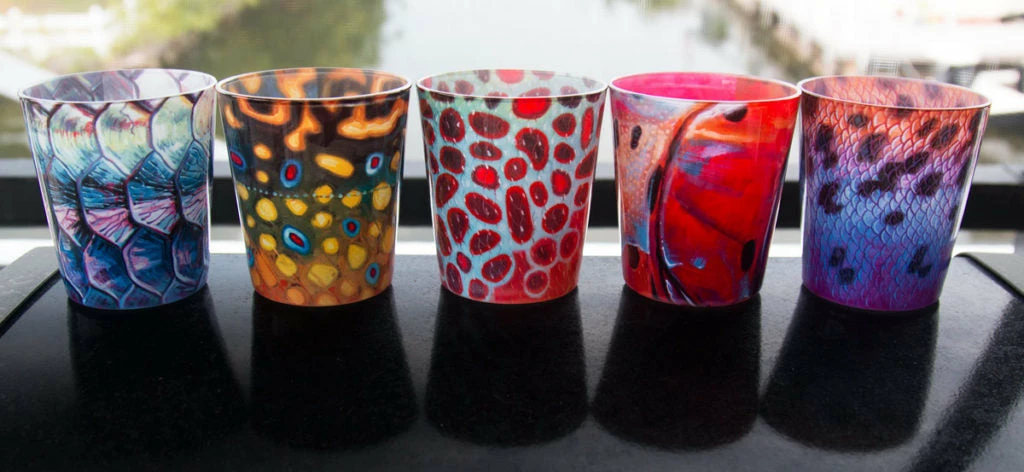 A rocks glass is a short tumbler used for serving a drink like whiskey (on the rocks) or cocktails like the Old Fashioned. These heavy duty rocks glasses showcase the best of Derek’s Abstract Fish Flank Series in a beautiful fully wrapped print within the glass. Available in Rainbow, Brown, Brookie or Cutthroat. Buy as singles or as sets. Great compliment to the Pilsner Glasses. Microwave safe, but not dishwasher recommended. Made in the USA.