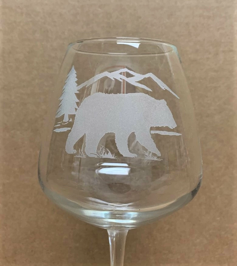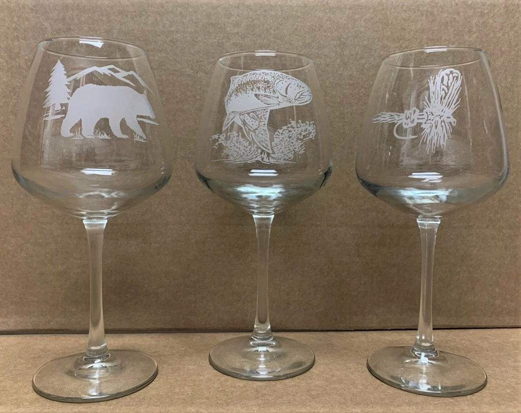 Sold in sets of 4, 18oz. Elegance Diamond Wine Glass. Sand Carved by Hand with Trout Artwork for a detailed deep etch.