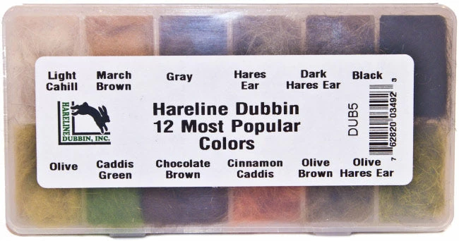 100% rabbit hair, perfectly blended. This dispenser includes the following 12 colors of Hareline Dubbin: Light Cahill, March Brown, Adam’s Grey, Hare’s Ear, Dark Hare’s Ear, Black, Olive, Caddis Green, Chocolate Brown, Cinnamon Caddis, Olive Brown, and Olive Hare’s Ear.