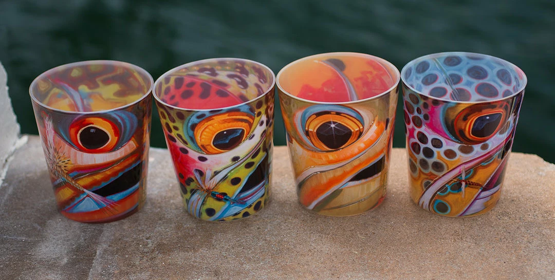 A rocks glass is a short tumbler used for serving a drink like whiskey (on the rocks) or cocktails like the Old Fashioned. These heavy duty rocks glasses showcase the best of Derek’s Abstract Fish Flank Series in a beautiful fully wrapped print within the glass. Available in Rainbow, Brown, Brooke or Cutthroat. Buy as singles or as sets. Great compliment to the Pilsner Glasses. Microwave safe, but not dishwasher recommended. Made in the USA.