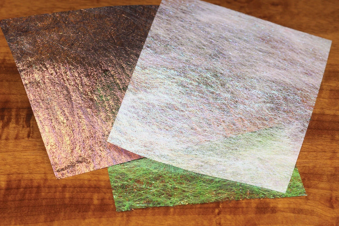Sheer material made of Ice Dub. Has a great sheen for wings, backs and cheeks. Unlike Adhesive Backed Ice Dub Shimmer Sheer, Ice Dub Shimmer Sheer is fused and is a lighter more delicate material that will work for wings and wing cases without additional glue or goo. Add a sheer wing case on standard trout nymphs easily with this material. Great for Stonefly Nymph Backs when you want the entire back of the fly to be a solid sheer sheet of Ice Dub.