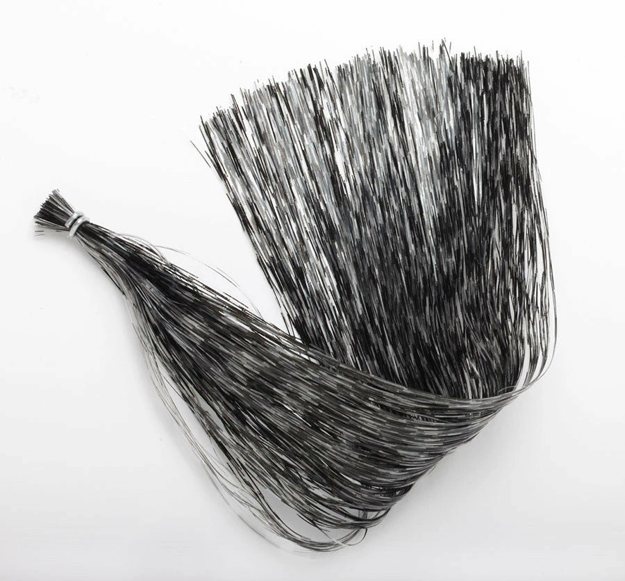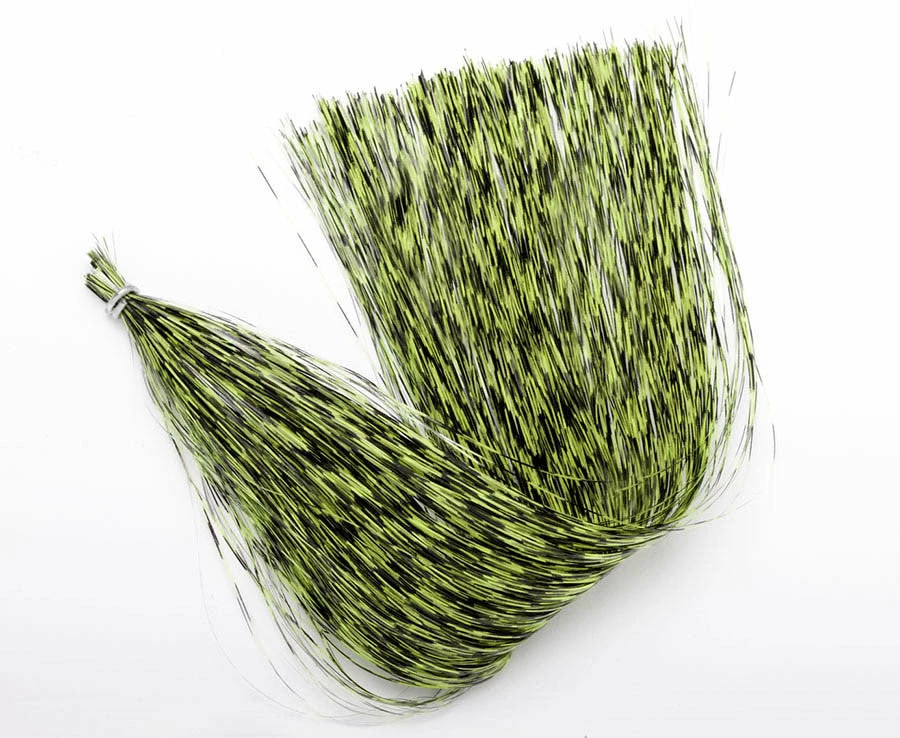 Transparent colors with a black bar. An excellent synthetic alternative for the expensive grizzly feather. Contains approximately 1,250 strands, 1/69” wide by 10” long.