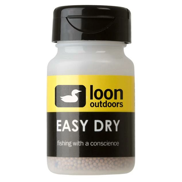 A treatment to revive flies composed of two things: drying beads and blue indicator crystals. A fly (still attached to the leader) is dry after a few quick shakes and ready for floatant. The blue indicator beads turn pink when the drying beads have become saturated and it is time to get a new bottle of Easy Dry.
