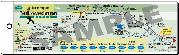 Waterproof map of the Yellowstone River, laminated. Includes hole for easy mounting on gear.