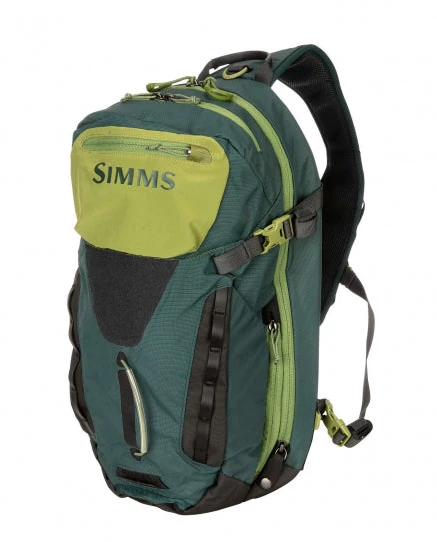 - Adjustable front panel contains loop field for wet fly storage, secured tippet holder, coated webbing daisy chain, and compression straps with rod storage