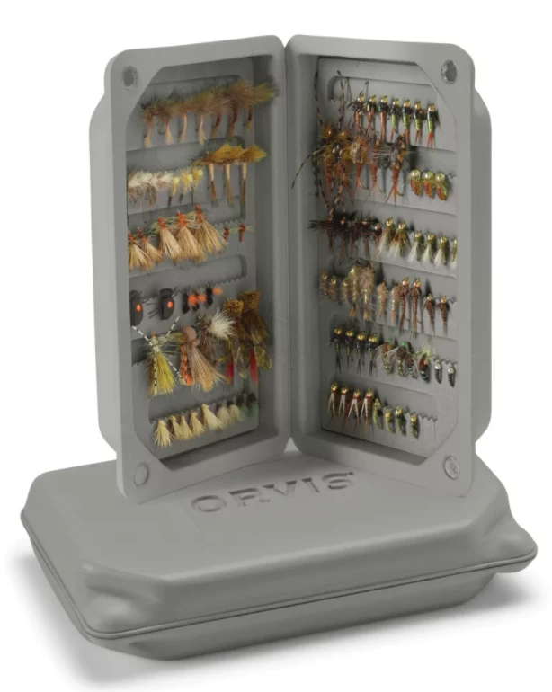 Ultralight floating fly box made of molded foam with micro slits in the interior. This allows flies to be backed in and protects the foam unlike ordinary foam boxes. Flies hold in place much better and if dropped in the water, the floating box is easily retrievable. Excellent weight reduction in pack or vest. In citron, storm gray.