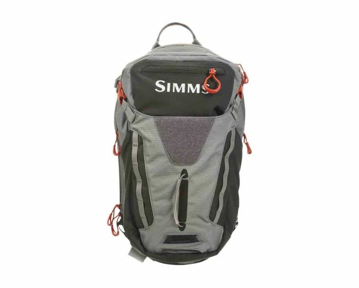 - Adjustable front panel contains loop field for wet fly storage, secured tippet holder, coated webbing daisy chain, and compression straps with rod storage